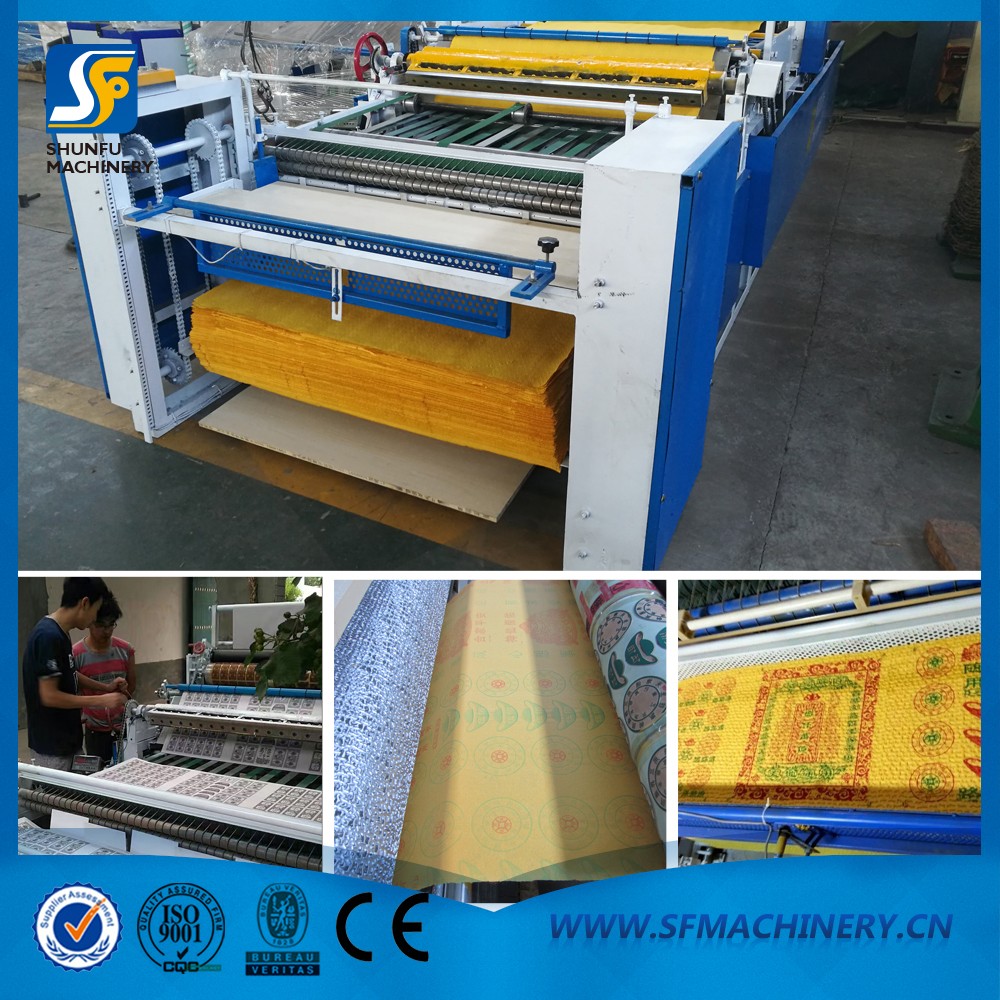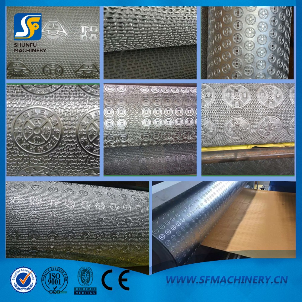 全自動燒紙印刷壓花機是針對迷信紙類的泡紙價格猛長開發的,該機結構緊湊合理,操作簡便,運行穩定,功能齊全,外型美觀大方。工作原理將卷筒紙經過染色輥印刷圖案,然后專業制作的凹型花紋鋼棍和附有彈性及耐溫的羊毛相對壓,使原來的平紋紙對壓成各類花型及紋路的泡紙(壓花可根據用戶需要制作各種不同清晰美觀的花紋圖案),已便增加紙的厚度(泡度),且對壓后的泡紙高度可通過兩棍對壓的壓力自行調節,自動電子計數、張數報警、自動裁切。